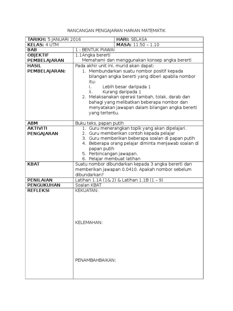 Coontoh Rancangan Pengajaran Harian Matematik Tingkatan 4 Pdf